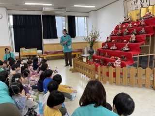 今日は遊戯室でみんなでおひな祭りをしました。お雛様の飾りを見て「きれいだね!」「おはなもかざってあるよ」と可愛らしい会話が聞こえてきました。おひな祭りの歌も歌いましたよ。 -
