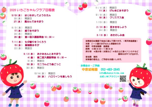 2~3歳の就園前のお子様を対象に、お母さんと一緒に遊んで頂く親子教室です。 また、お母さん同士の情報交換や親睦を深めて頂けたらと思います。 中京幼稚園ってどんなところ?何をして過ごすの? お子様と一緒に楽しみながら、幼稚園のことを知って下さい。