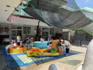 2025年7月7日 今年もプール開きの時期がやってきました。園庭に日除けを張り、大きなビニールプールや小さなものを用意し各学年ごとにプール遊びを楽しんでいます。新しい水鉄砲も増えて大喜びです。 -